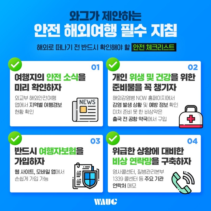 외교부는 해외 출국 전에 2가지 사항을 권장하고 있습니다.우선 해외 여행 보험에 가입하고 해외 체류 중인 현지 치료·입원 또는 국내 입국이 필요한 상황에 대비하고 출국 전에 해외 여행 보험에 가입하는 것을 추천합니다.국내에서 가입한 실비 보험은 국내 의료 기관에서 발생한 비용에 대해서 보상하고 있습니다.해외 여행 보험에 가입할 때도 실비 보험 가입자는 “실제 손해를 제외한 “에서 여행 보험에 가입하지 않으면 보험료가 이중으로 나오지 않습니다.둘째, 해외 안전 여행 앱 설치 해외 안전 여행 앱을 통해서 실시간 안전 정보 푸쉬 통지, 재외 공관 연락처 목록, 여행 경보 현황, 위기 상황별 대처 매뉴얼 등을 제공할 수 있습니다.앱에서 “모바일 동행 서비스”를 신청하자 긴급 사태 발생 시 등록된 비상 연락처부터 국내 가족 혹은 함께 여행 중의 지인에 위치 정보를 문자로 송신할 수 있습니다.그럼 해외 여행 보험과 해외 안전 여행 혜택과 이용 방법에 대해서 봅시다. 해외 여행 보험의 가격 및 혜택